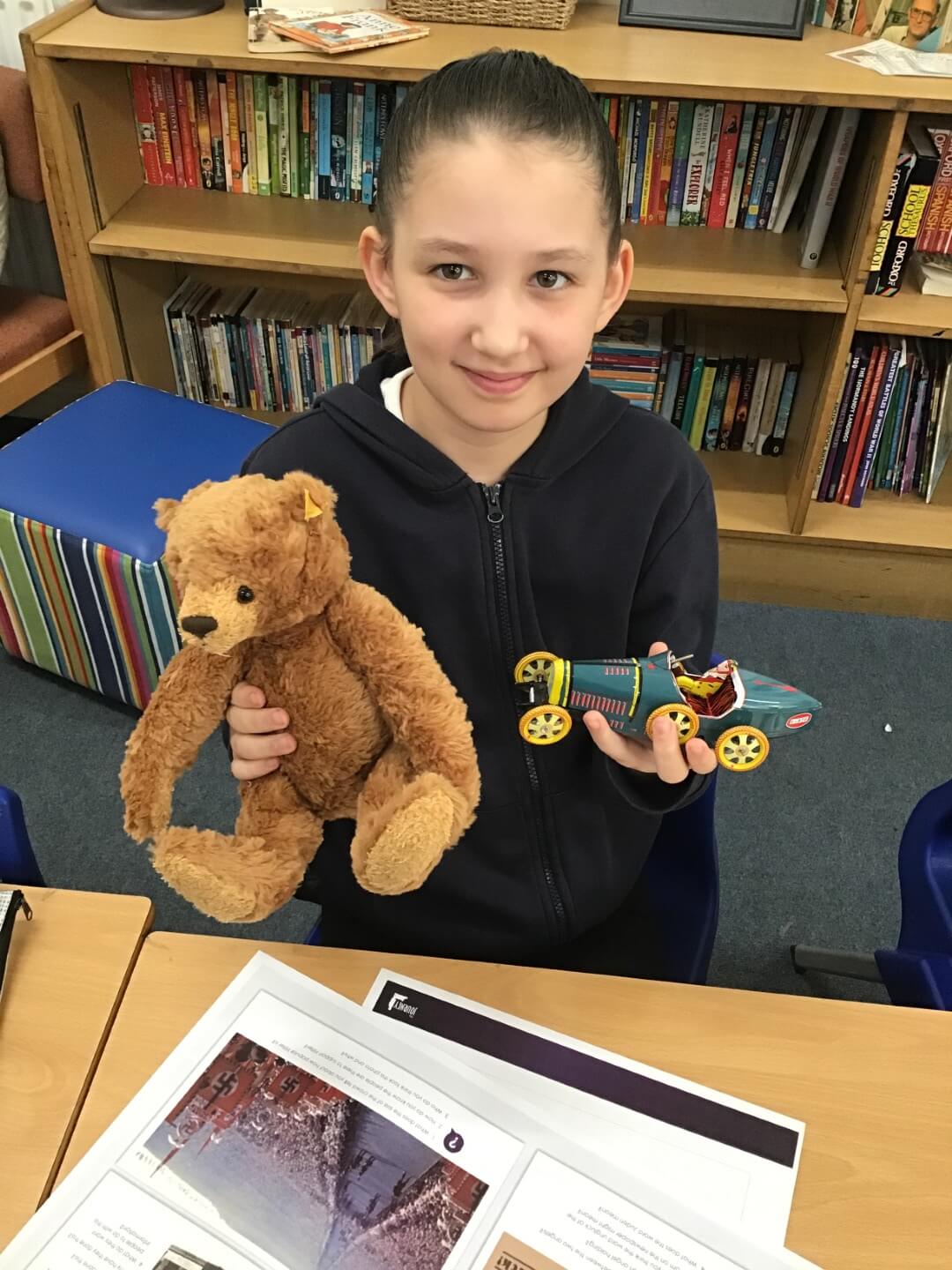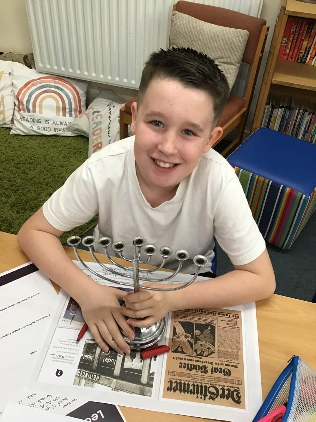 Debbie shared real artefacts from the museum to help bring Leo’s story to life, and the children explored first-hand testimonies, photographs, propaganda posters, and video accounts to deepen their understanding of how Jewish people were treated in Nazi Germany and the impact of the Kindertransport.