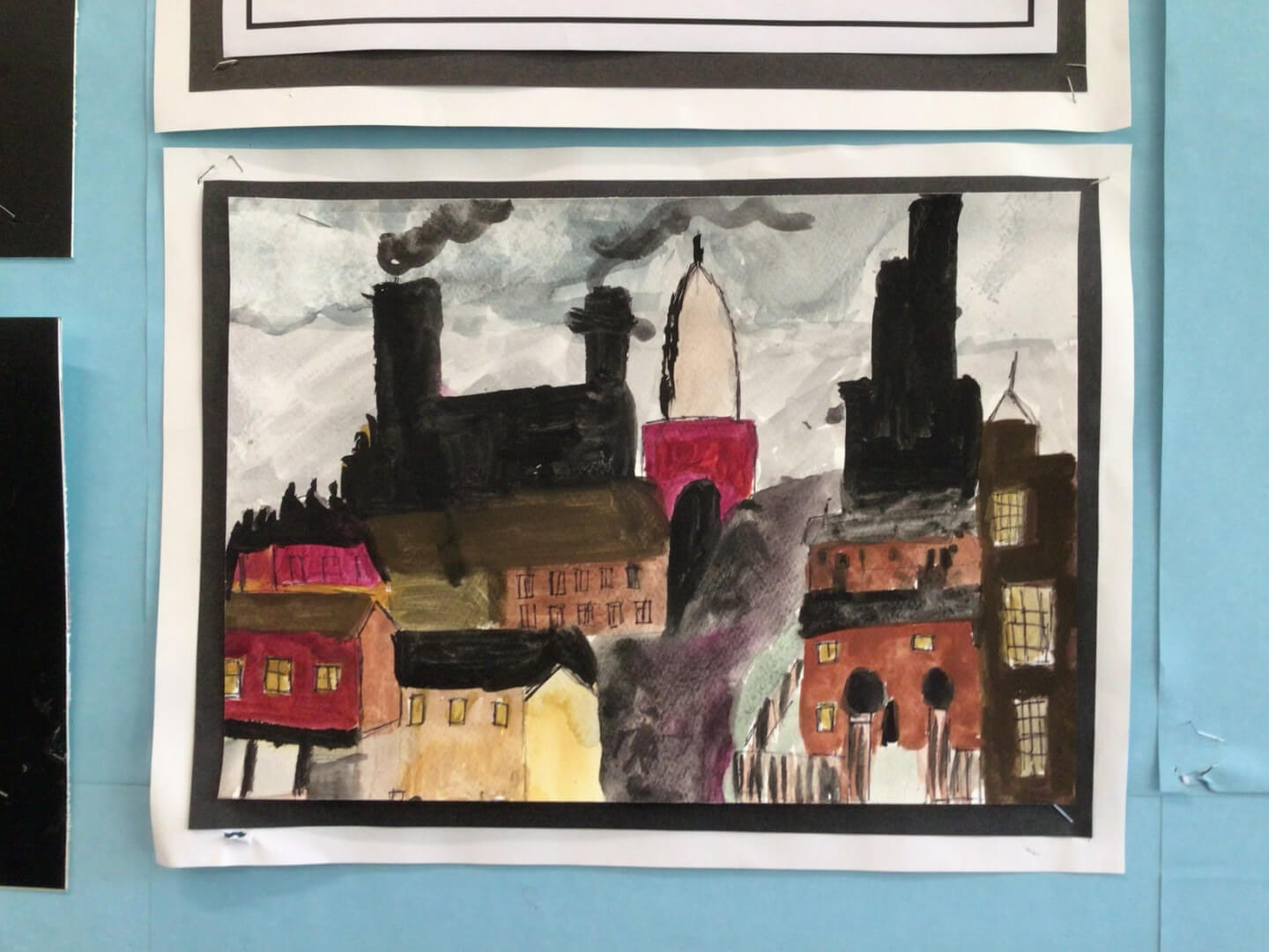 The children focused on using muted colours such as greys and browns to reflect the industrial scenes of the North of England during the Industrial Revolution, capturing the style and mood of Lowry’s work. Well done, Class 13!